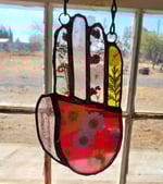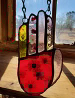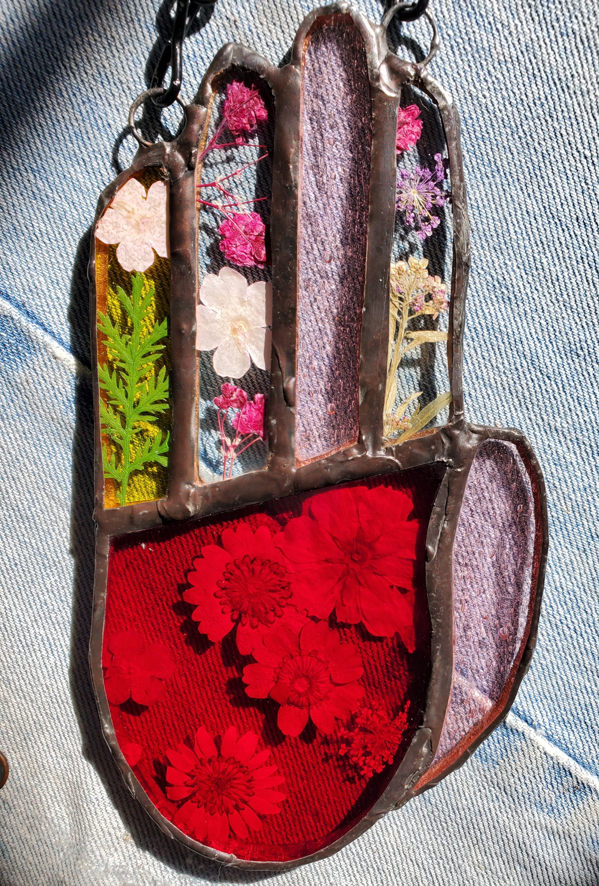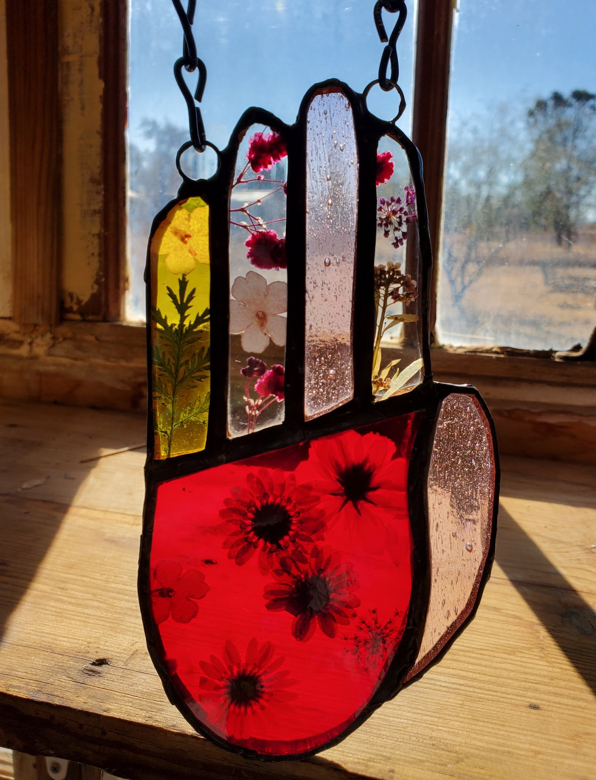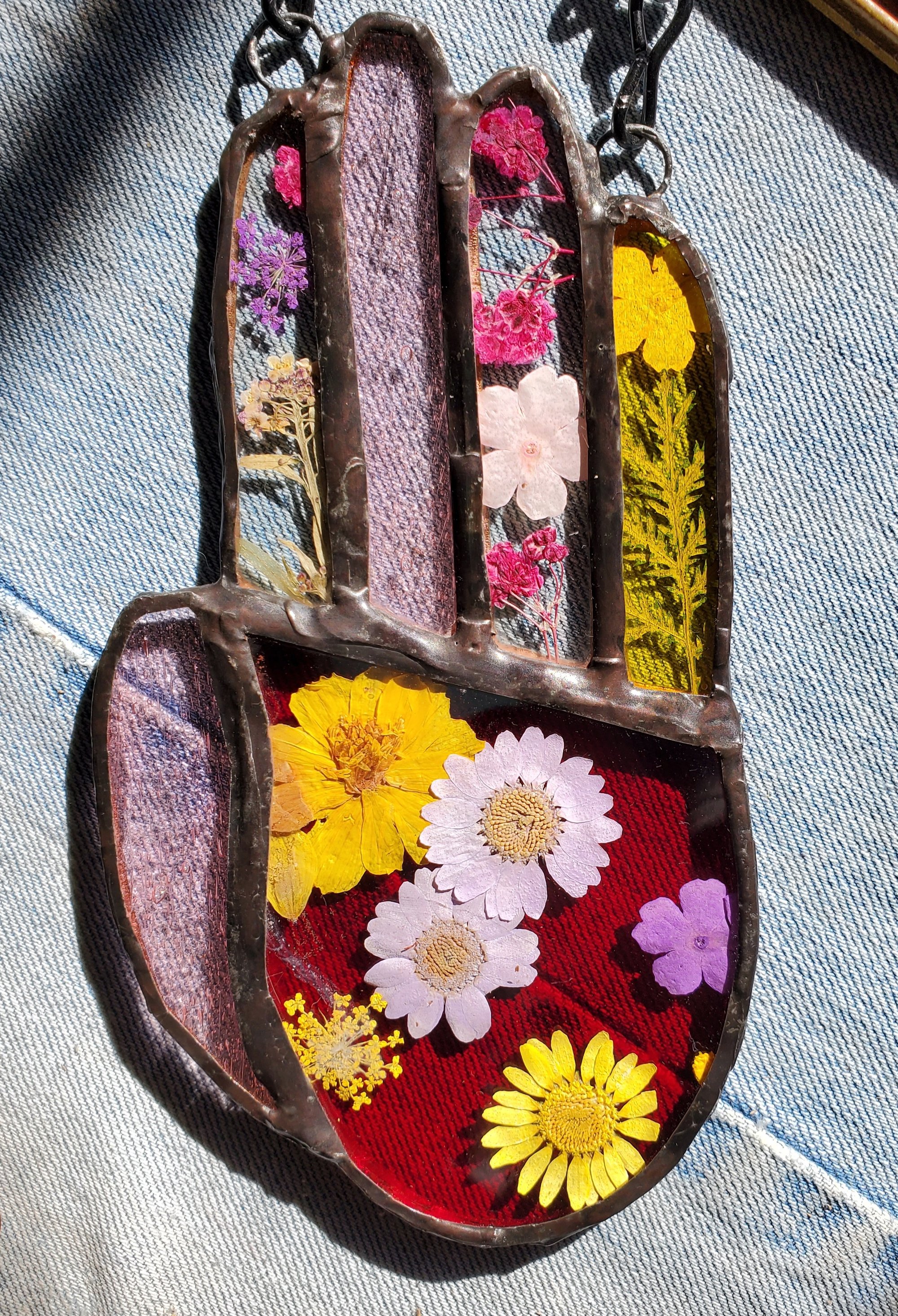 This represents an idea or prototype of a hand with colored stained glass with inclusions.